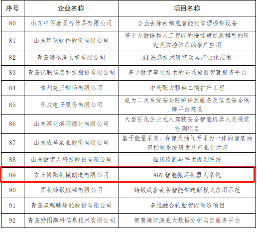 為(wéi)貫徹落實省委省政府(fǔ)關於推進“現代(dài)優勢產業集群+人(rén)工智能”的工作部(bù)署,省工信廳組織開展了第二批“現(xiàn)代優勢產業集群(qún)+人工智能”試點(diǎn)示範企(qǐ)業及項目的征集遴選工作,經企業申報、十強產業專班及各(gè)市工信局、有關行業協會等推薦、專家評審,評(píng)選了221個試點示範企業和項(xiàng)目。安(ān)丘博陽機(jī)械的“AGV智能搬運機器人係統”項目成功入選。