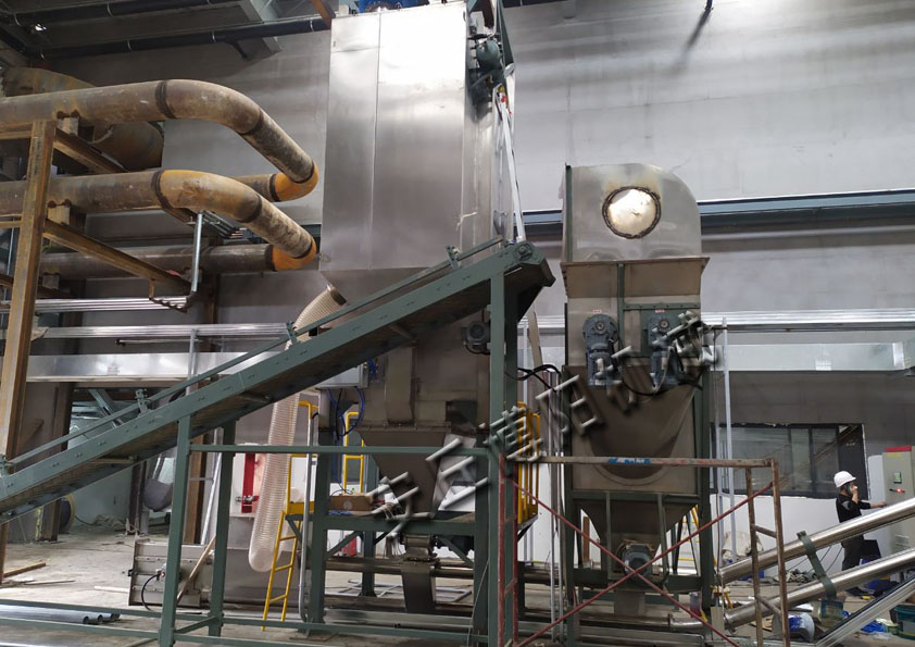 PVC粉噸袋拆包機+自動拆(chāi)包機(jī)+管鏈輸送機現場
