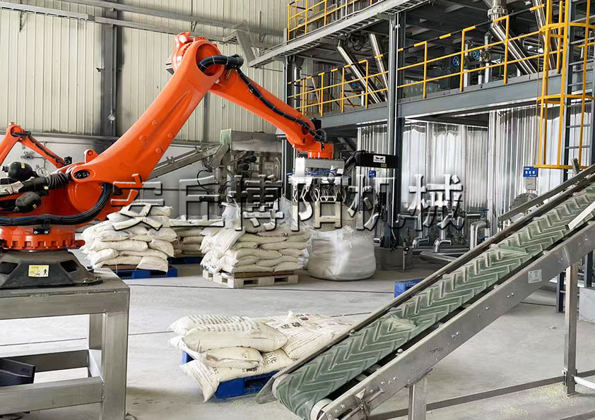 袋料由機器人拆垛(duǒ)機將袋料(liào)抓取提升至割袋裝置上方,由割袋裝置拆袋,物料落入儲料罐內,機械(xiè)抓手通過抖動清空料袋將廢袋放入收集箱內,整個操作過程無(wú)需人工參(cān)與,實現自動(dòng)化減人(rén)目標。